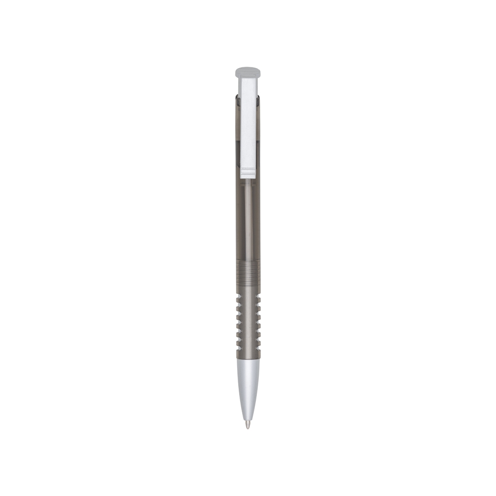 Caneta plástica com carga esferográfica azul e acionamento por clique.